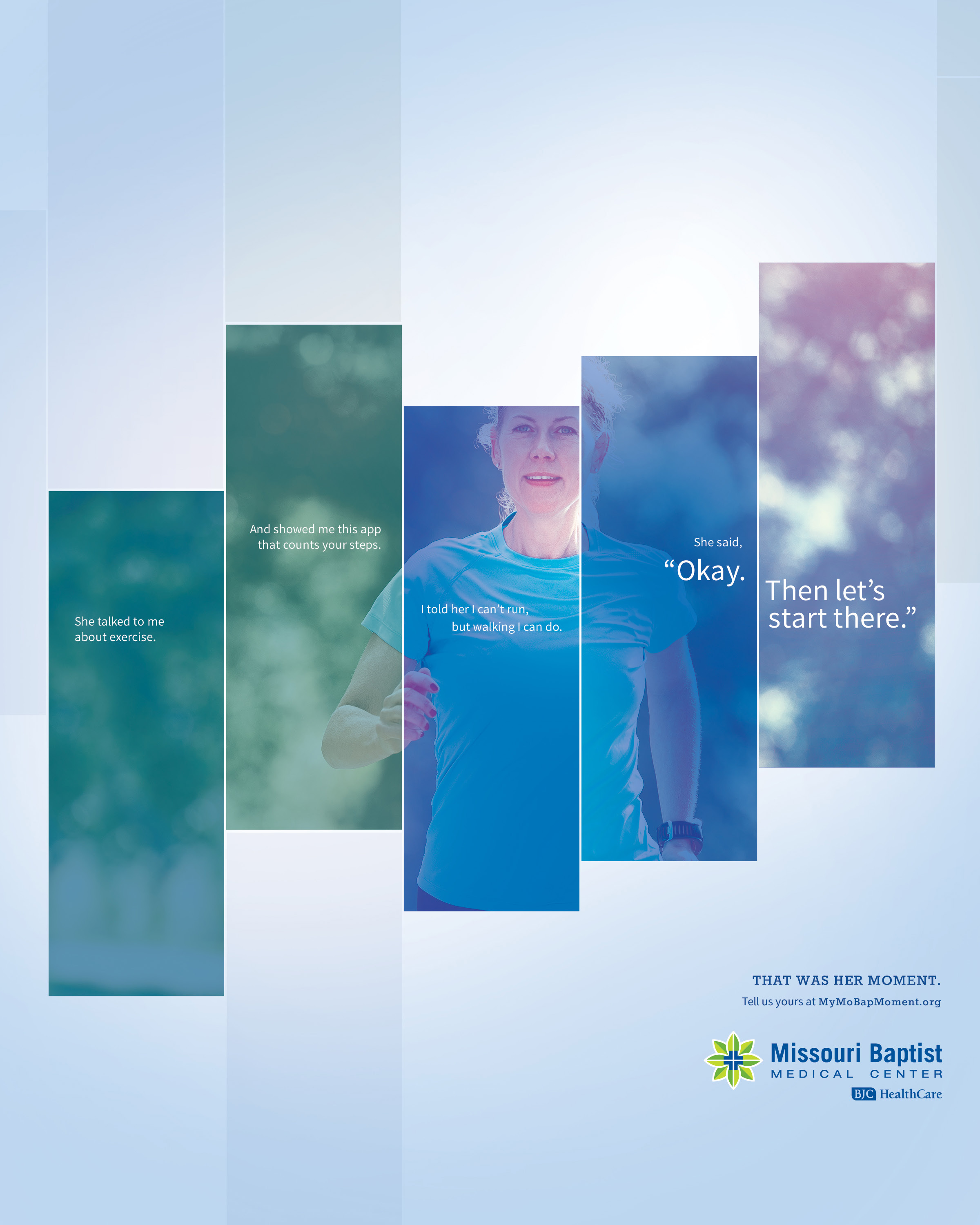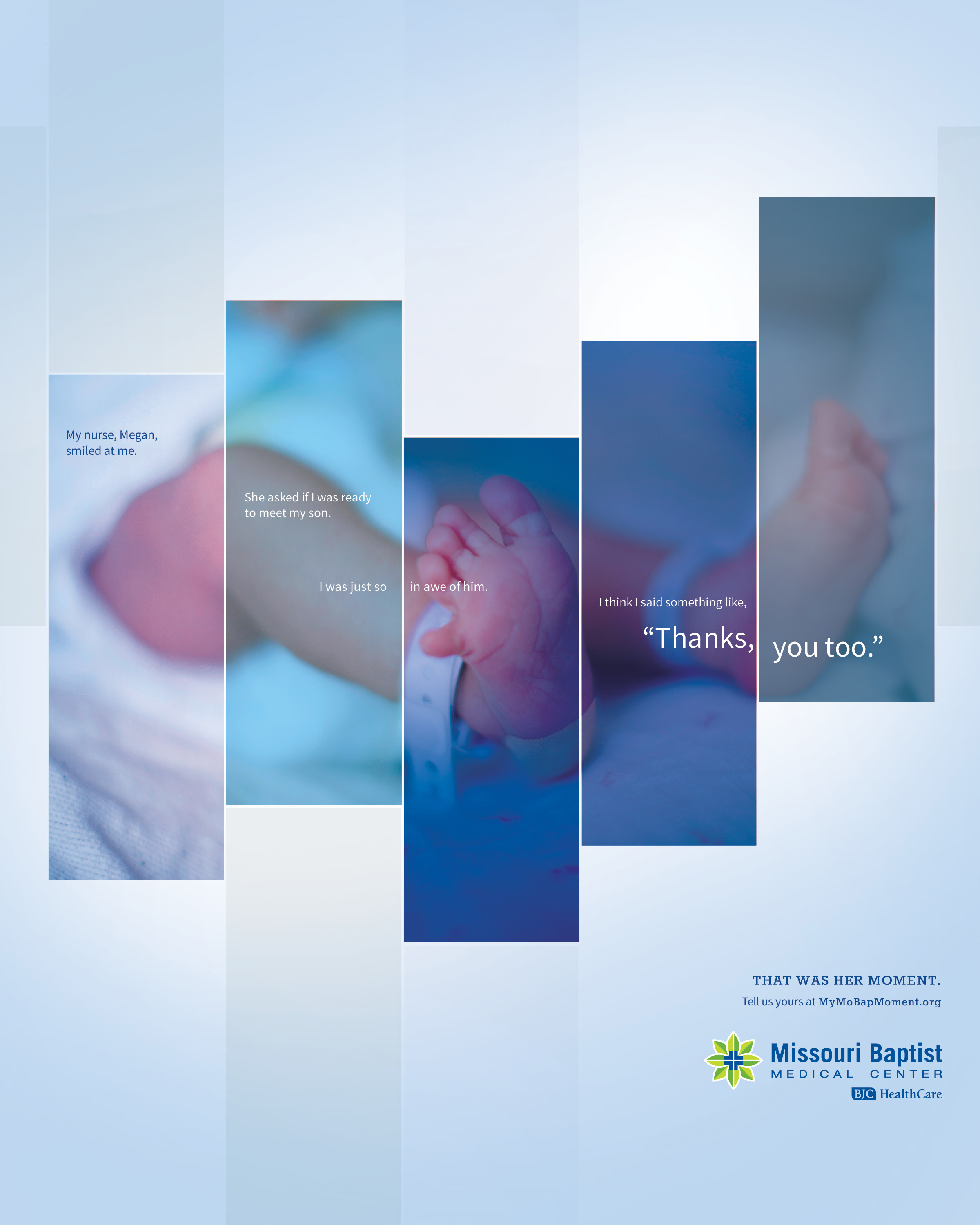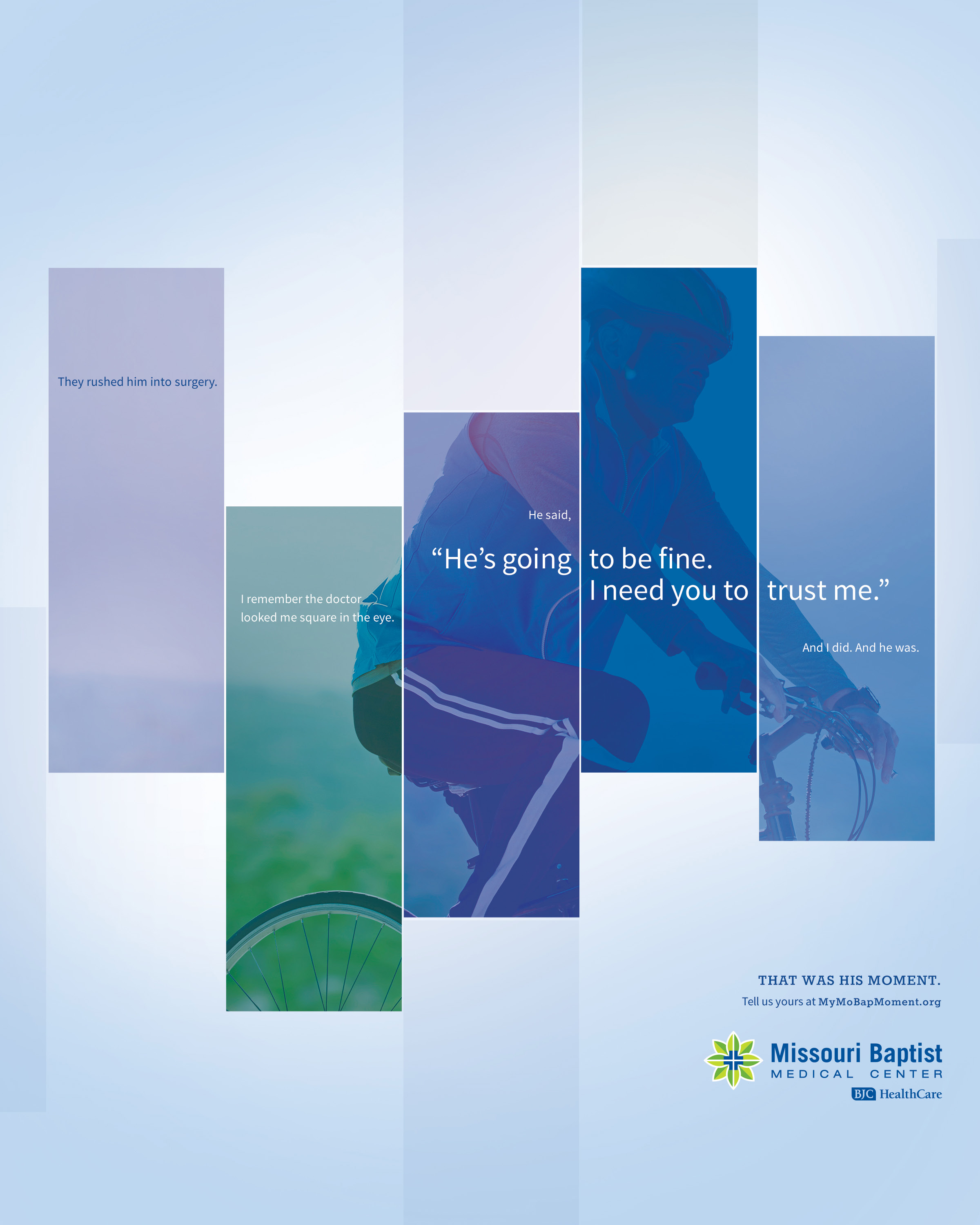 Anyone that's been to or had a loved one cared for at Missouri Baptist Hospital knows that it's a special place filled with countless stories of hope. Referencing their iconic color-changing tiles that blanket parts of the hospital, we created a print campaign concept that shares those stories by focusing on the singular moments that made all the difference in the lives of real-life patients.